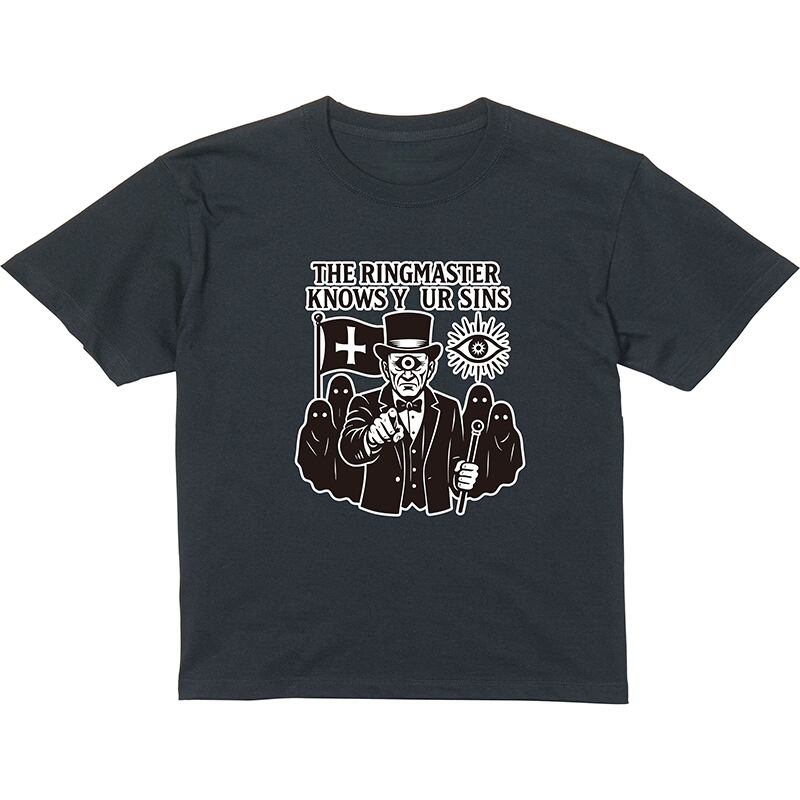 中央に立つリングマスターが、まるで観る者を糾弾するように指を差すデザインのグラフィックTシャツです。
