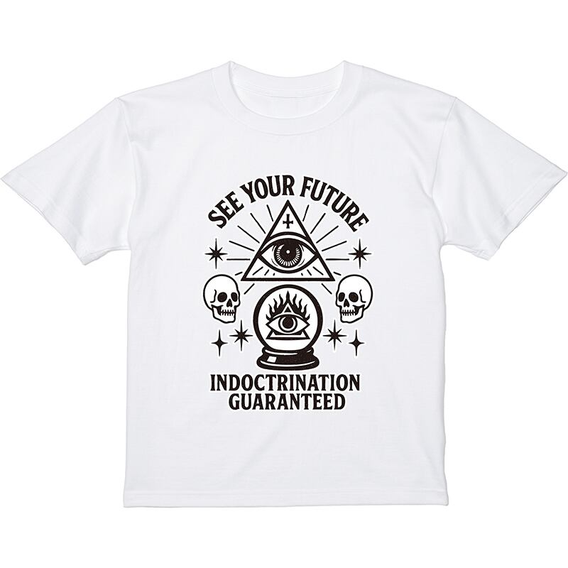 上部には「SEE YOUR FUTURE(未来を見よ)」、下部には「INDOCTRINATION GUARANTEED(洗脳保証)」といった意味深なメッセージがプリントされています。
